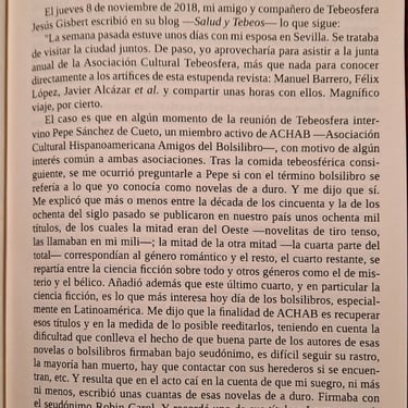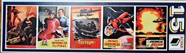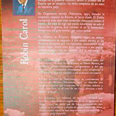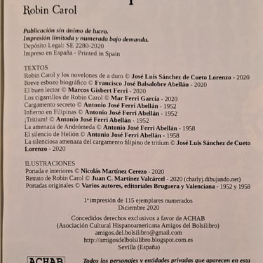 Que mi abuelo Antonio, yeclano hijo de bracero y tornero y criado por su tía materna Juana la modista, escribiera alguna novela de quiosco en su juventud, con el seudónimo de Robin Carol, no me era desconocido. Incluso conservaba algún original en el fondo de la estantería, como rareza, o quizás reliquia, familiar. La sorpresa llegó cuando Pepe Cueto, editor sevillano, y avatares mediante, contactó a los herederos (queda mi madre), interesado en investigar y publicar «la obra completa de Robin Carol» (?). Es una editorial modesta, impulsada con la voluntad y pasión propias del coleccionista y aficionado por lo raro y curioso, como una suerte de cámara de las maravillas de la era humanista. En su caso, les impulsaba particularmente las llamadas novelas ‘de a duro’, ‘bolsilibros’ o ‘de tiro tenso’ que tanto se publicaron en los años 50 y 60 en todo el estado español. Eso que hoy se ha convenido en llamar ‘literatura pulp’. Y resulta que Robin Carol llegó a publicar cinco de ellas, de los géneros bélico… policiaco… ¡y espacial!