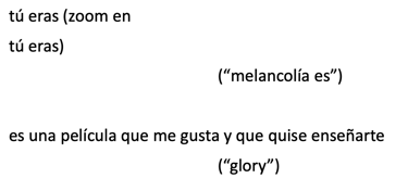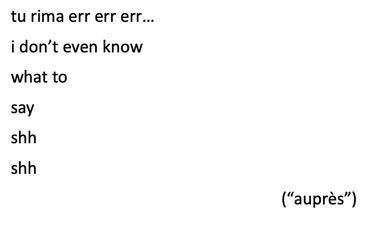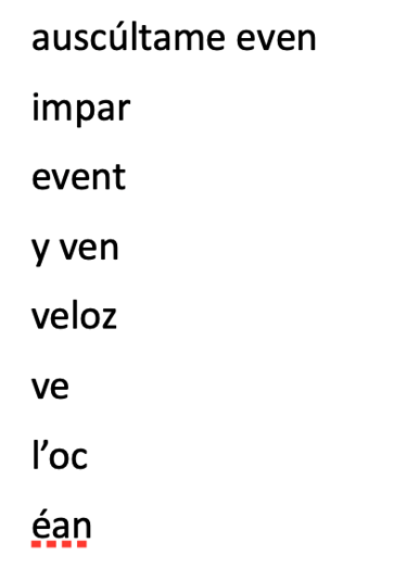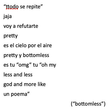 En segundo lugar, se produce una ruptura del sentido mediante recursos morfológicos de la lengua que tienen incidencia en aspectos fonológicos, también por la mezcla de idiomas y los cambios de código. Así, en el mismo poema, encontramos la siguiente disrupción del lenguaje con efectos fonológicos a través de recursos morfológicos de lenguas distintas: