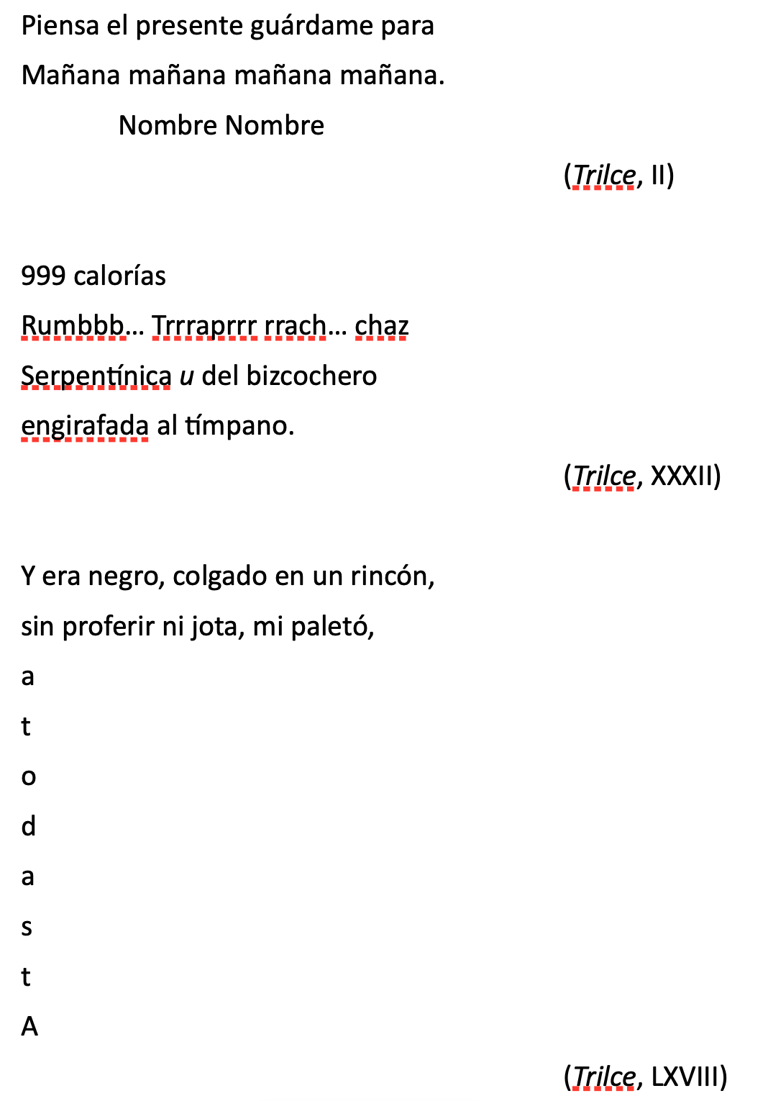 Basta un mínimo de competencia lingüística para percibir la tendencia disruptiva para con el lenguaje que pretende el texto, con los binomios pec/pez y, en el plano semántico, la búsqueda de imágenes inconexas que nos traslada directamente al imaginario vanguardista del surrealismo (peces/flores). Tal experimentación con el lenguaje, de hecho, se afilia directamente a técnicas propias de tales vanguardias, específicamente del mencionado surrealismo, así como del creacionismo, con el César Vallejo de Trilce (1922) y el Vicente Huidobro de Altazor (1931) como máximos exponentes. Hagamos un breve análisis comparativo con las muestras hasta ahora vistas de The Cash Project, con los siguientes versos experimentales de los poetas mencionados: